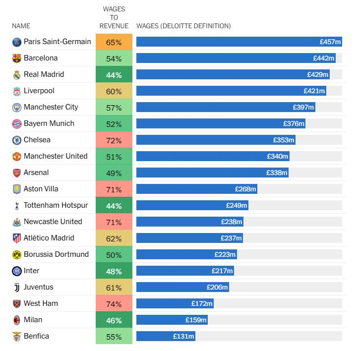 欧洲各队24/25工资支拨Top 20及占比情况: