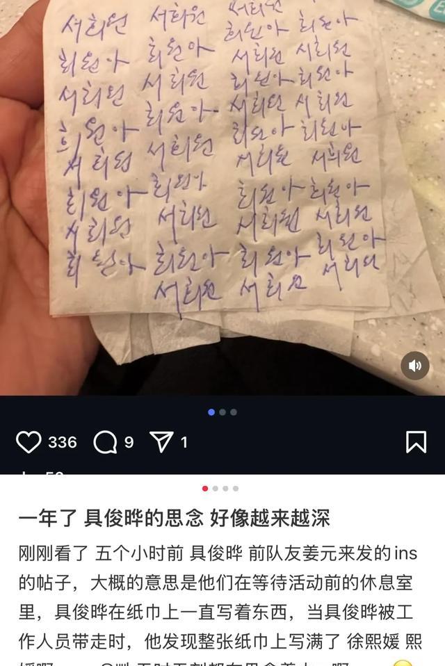 他在莽撞平台发文清晰出细节,在恭候活动前的休息室里,具俊晔一直在纸巾上写东西,自后才发现,纸巾上写满了“徐熙媛”三个字。