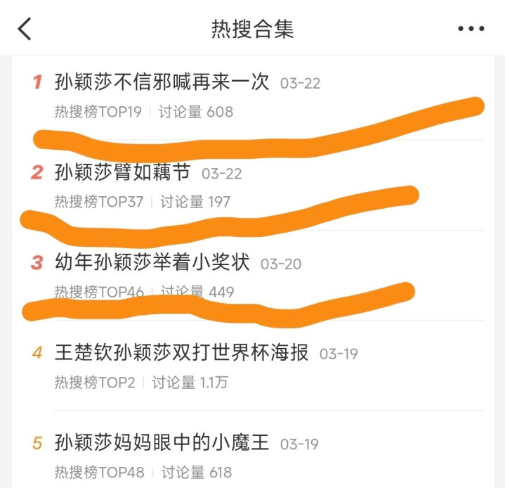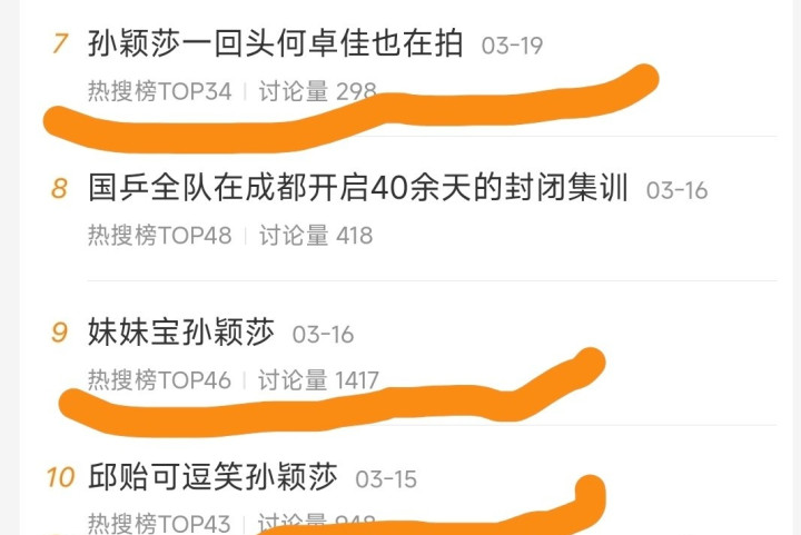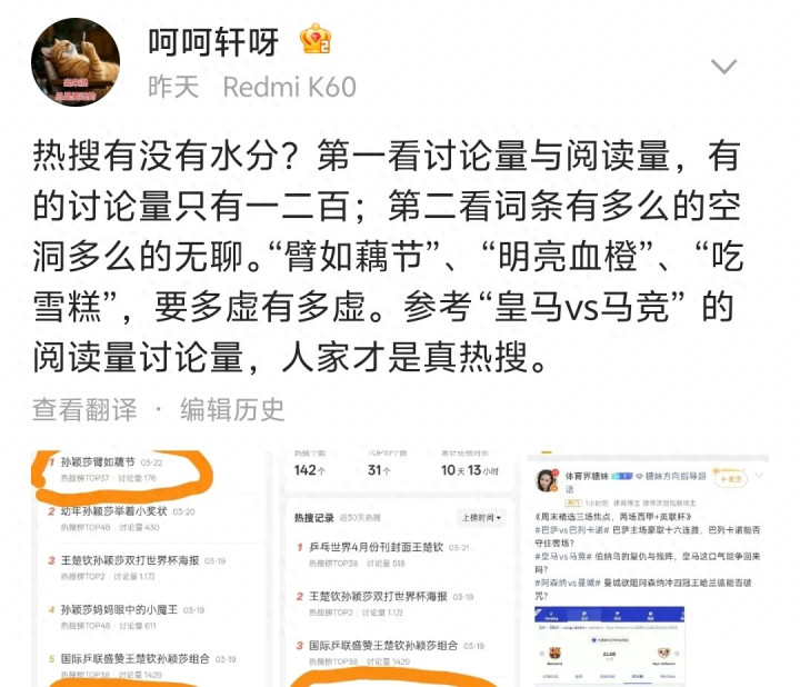 贺晓龙刚刚又发文直指面前的体坛热搜作假,他平直发了一个截图,指出了现时乒乓球的热搜问题。他认为热搜当今的水分很大,具体的等于商榷量跟阅读量皆备不成比例。他截出了好几张图,都是最近一段时候孙颖莎和王楚钦的热搜。发现了一个问题,那等于一开动热搜话题的商榷量极低,上了热搜之后商榷量才开动增大。