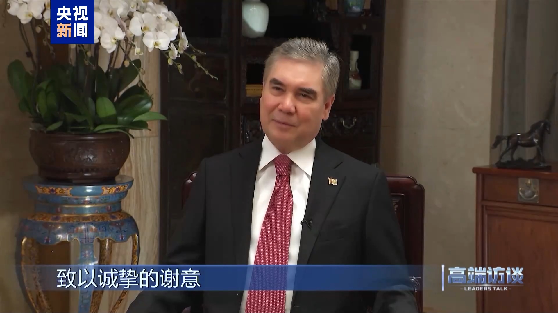 土库曼斯坦民族首级、东谈主民委员会主席别尔德穆哈梅多夫,在访华期障碍受央视《高端访谈》专访