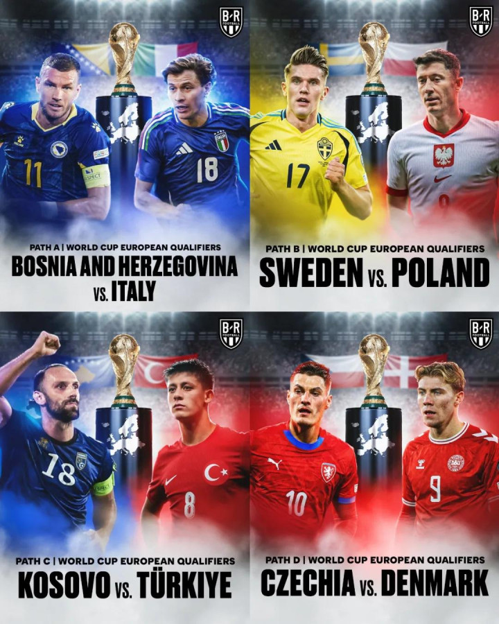 终末的4场决赛对阵分裂为:波黑vs意大利,瑞典vs波兰,科索沃vs土耳其,捷克vs丹麦——8支球队将角逐欧洲区终末的4张门票。