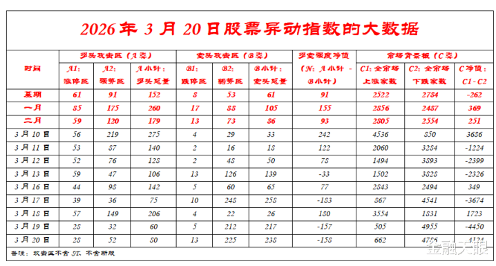 2026年3月20日,A股阛阓呈现出顶点分化态势,三大指数涨跌互现,创业板指高潮1.3%,关联词全阛阓超4700只个股下落,成交额放大至2.3万亿。盘面上,光伏、电板、电力等新动力赛说念逆势崛起,算力租出、化工、游戏等板块则遇到重挫。咱们自主研发的“股票异动指数系统”闪现,当日多头抽象指数回升33%,但多空强度净值(N值)依旧深陷-158的负值区间,灵活地响应出阛阓“冰火两重天”的剧烈结构分化神气——少数热门板块狂欢,大都个股消极失血。