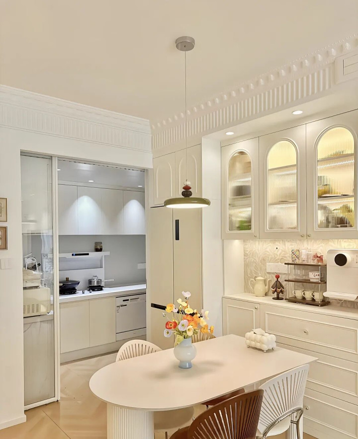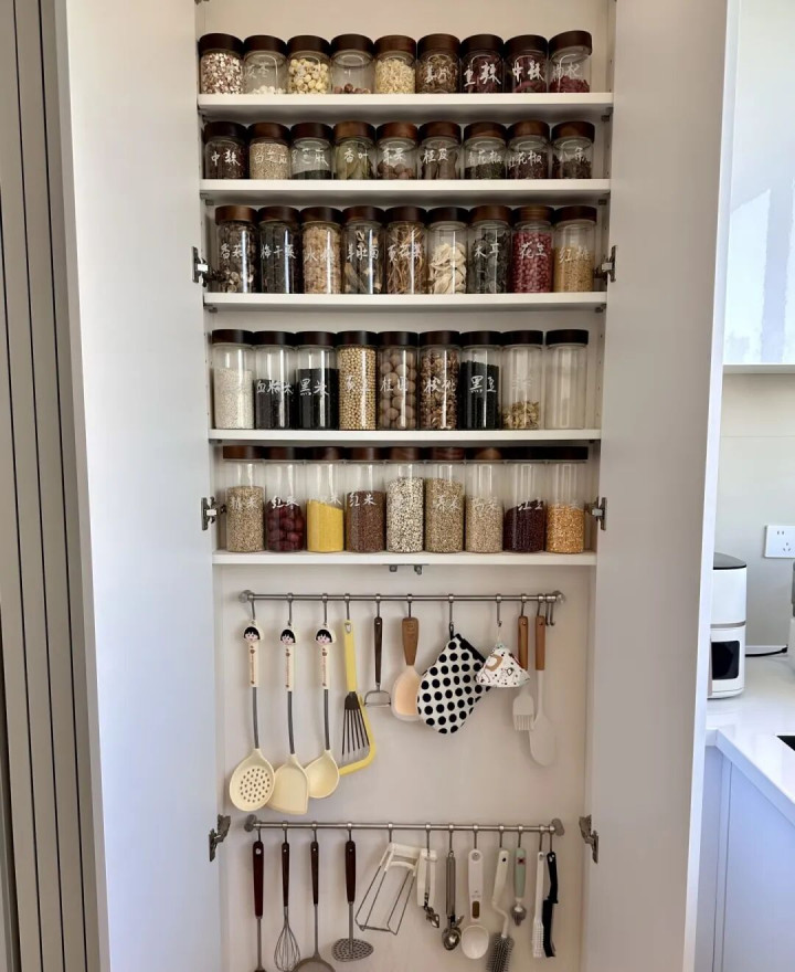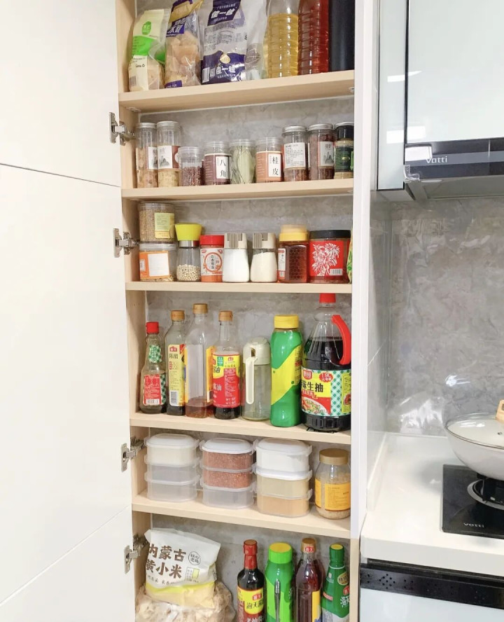 况且,瓶瓶罐罐一目了燃,取用格外便捷,关上门后更是一片从简好意思不雅, 厨房看起来更是干净利落。