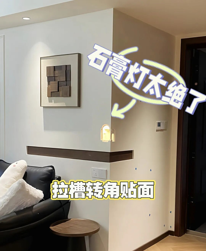 在沙发背后的小拐角,绸缪一个石膏壁灯,不仅能增多照明,还能营造氛围感,格外调节。