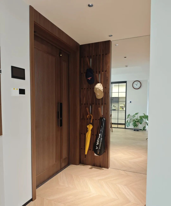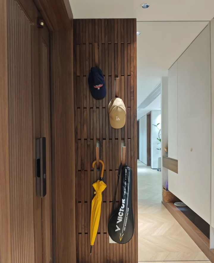 这面“钢琴键”墙不仅好意思不雅,还至极实用。轻轻一拨,就能贬责进门时急着挂东西的问题,包包和钥匙王人有了落脚之处。