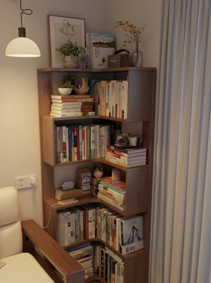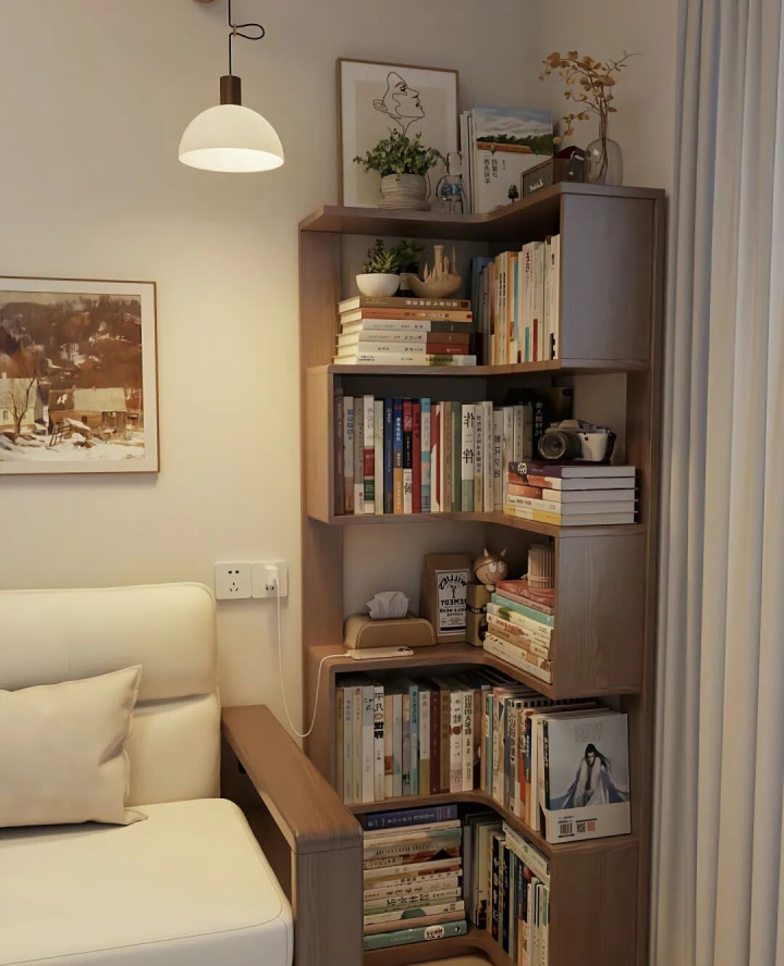 此外 这种转角书架还妥当任何有边缘的地点,不仅填补了空缺,还让空间的使用更生动。