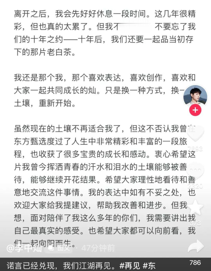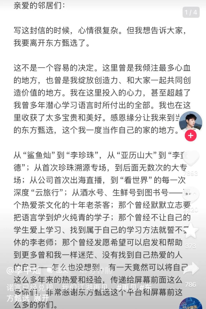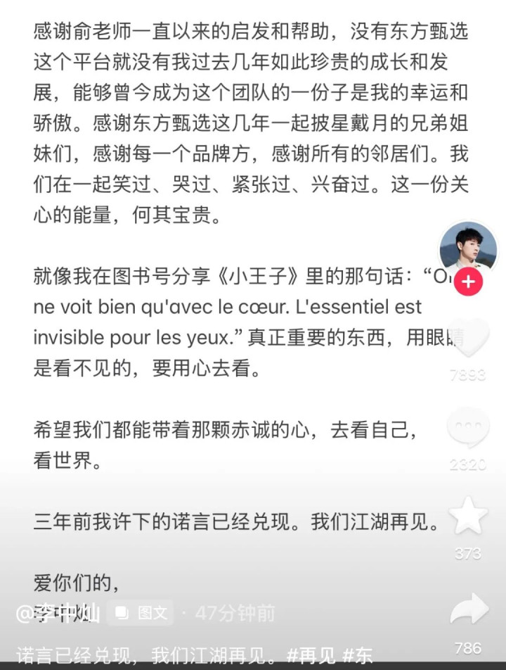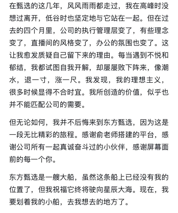 4月25日下昼, 东方甄选明明在应付账号发文回话下野, 原文如下: