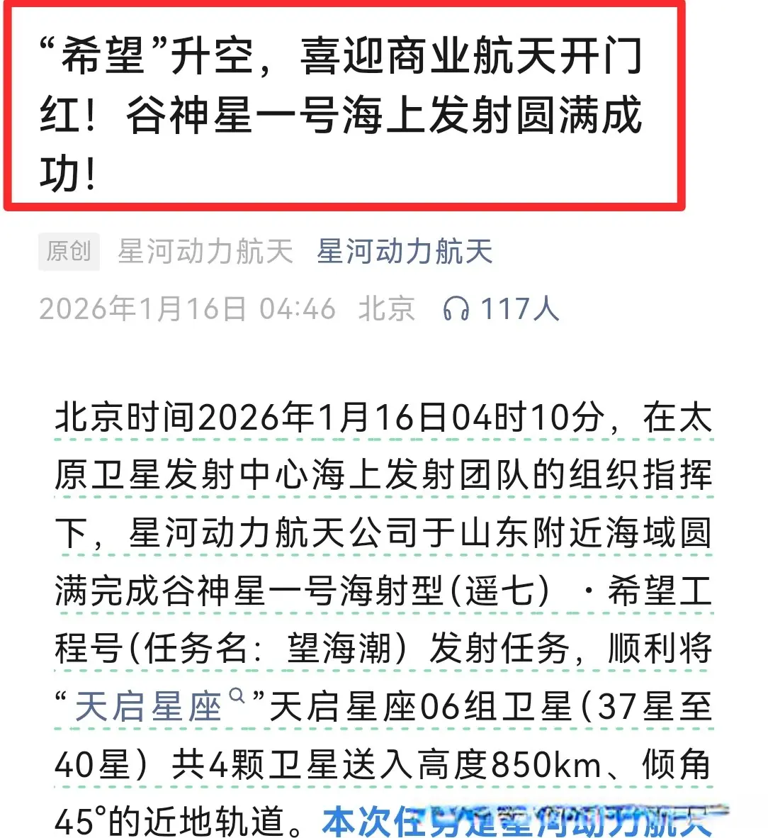 2026年1月16日,银河能源航天公司在山东隔壁海域辐射谷神星一号海射型(遥七)输送火箭,顺利将天启星座06组卫星共4颗卫星送入预定轨说念。