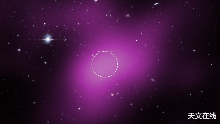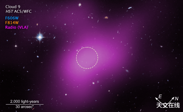 这张图像以品红色泄露了位于距今约1600万光年远的梅西耶94星系外围区域中被称为云9的中性氢气体探伤成果,重迭在哈勃空间千里镜对该天区拍摄的深度光学图像之上。白色圆圈标示的区域内迄今未发现任何恒星迹象,但通盘这个词品红色区域仍捏续存在约100万倍太阳质料的中性氢气体。 图片开首:J.德帕斯夸莱(天外千里镜科学盘问所)