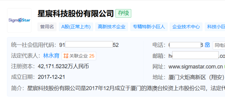 天眼查露出,星宸科技竖立于2017年12月,位于福建省厦门市,2024年3月在深交所创业板上市,专注于端边侧AISoC芯片的研发、瞎想与销售,产物心事智能安防、智能物联、智能车载三大中枢领域,禁受Fabless无晶圆厂的贪图阵势。