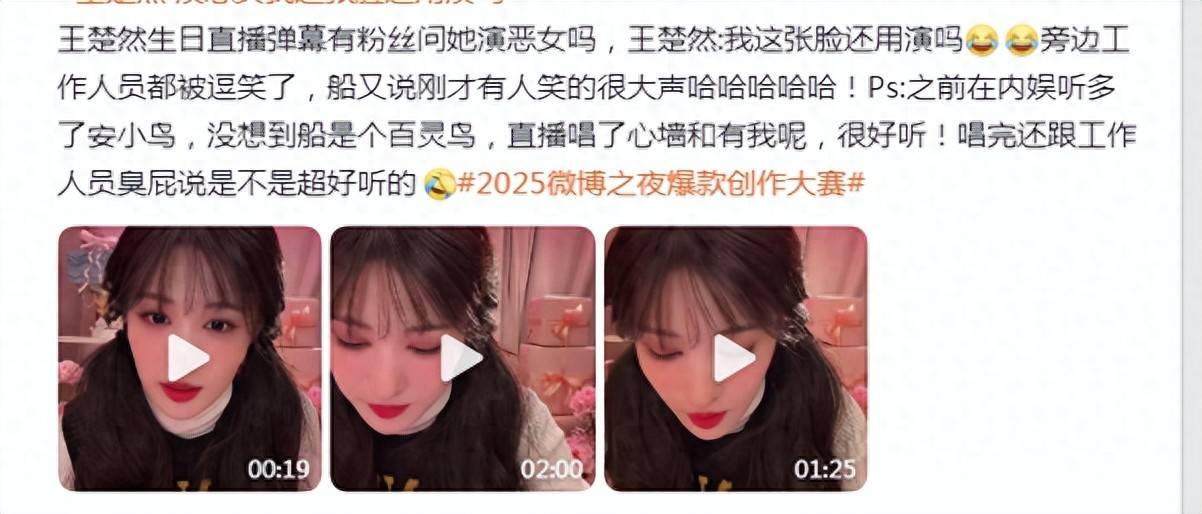 在王楚然的诞辰直播中,粉丝通过弹幕发问:“演恶女吗?”王楚然自信反问“我这张脸还用演吗”,并簸弄现场“有东谈主笑得很高声”。