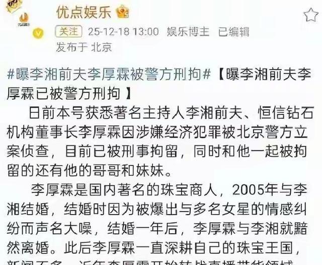 屋漏偏逢连夜雨,前夫李厚霖的丑闻更是让她雪上加霜。6月中旬,多家媒体报谈李厚霖因波及经济问题被带走拜访,固然两东谈主早就诀别,没了法律上的相干,但公论场哪管这些?“钻石富翁”的滤镜碎得稀碎,旧账新事被一谈翻出来,网友当然会把激情迁怒到李湘身上,毕竟当年的“朱门婚典”关联词她显示的成本之一,当今前夫出了事,她念念摘干净齐难!