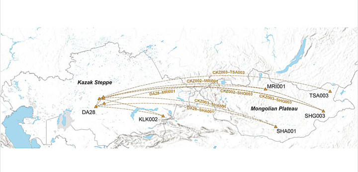 一张中亚舆图,图中线条从哈萨克草原蔓延至蒙古高原,旨在展示这两个地区之间的遗传关系。图片开端:威斯康星大学麦迪逊分校