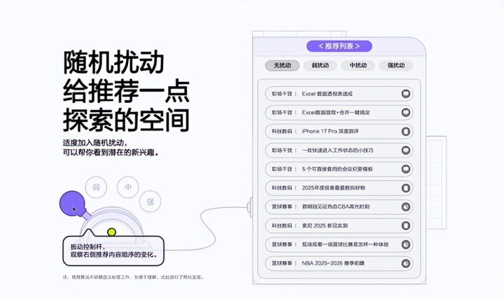 在互动演示中拖动立时扰动强度,能不雅察到推选列表从单一到多元,体验立时扰动带来实践万般性,剖判算法奈何禁闭“信息茧房”,不仅要发现和记着用户心爱的实践,也匡助用户挖掘潜在兴味、看到更广阔的宇宙。