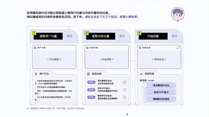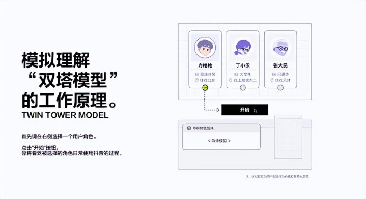 双塔模子是抖音进行高效调回的主力模子之一,体验者可代入不同用户扮装,看到算法绸缪假造用户与视频的推选指数,直不雅感受实践与用户的匹配逻辑:
