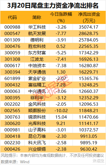 17股尾盘主力资金净流出均超1亿元,华工科技、航天发展、德明利、胜宏科技4只个股净流出金额均超2亿元。东方金钱、江波龙、中油成本、天孚通讯等个股净流出金额也较高。