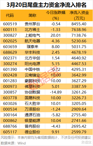 从个股来看,尾盘莫得个股净流入超1亿元,贵州茅台、朔方稀土、上能电气净流入资金均超7000万元。
