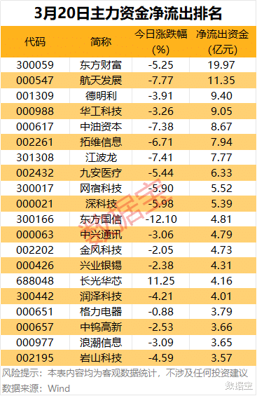航天发展净流出资金超11亿元,股价大跌超7%;德明利、华工科技净流出资金超9亿元,中油成本、拓维信息、江波龙、九安医疗净流出超6亿元。