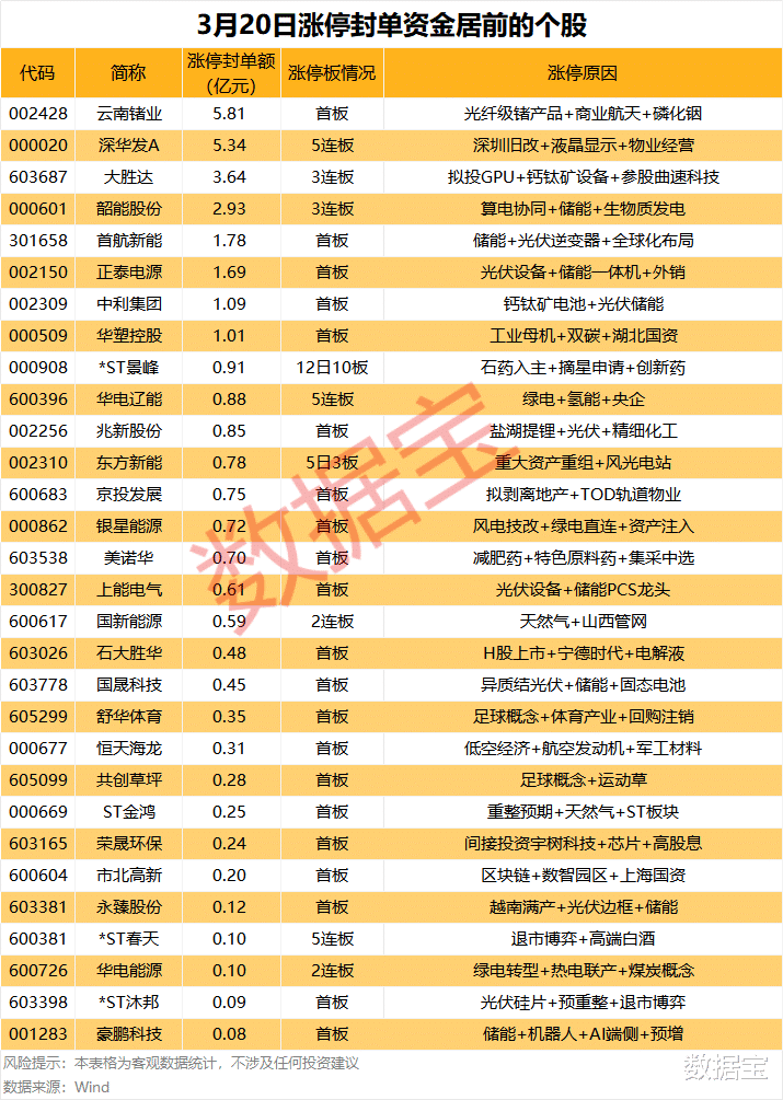 以封单金额盘算,云南锗业、深华发A、大捷达等涨停板封单资金居前,区别有5.81亿元、5.34亿元、3.64亿元。