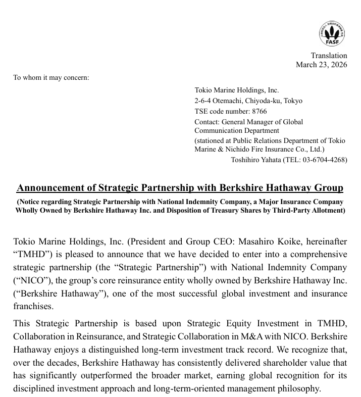 3月23日,东京海上控股发布公告称,公司将与伯克希尔缔造全面策略和解伙伴联系。看成策略和解的基础,伯克希尔旗下中枢再保障实体NationalIndemnity将收购东京海上控股已刊行流畅股2.49%的股份。交游金额为2874.1亿日元(约18.1亿好意思元),开动股份将通过料理东京海上控股捏有的库存股份进行配售。