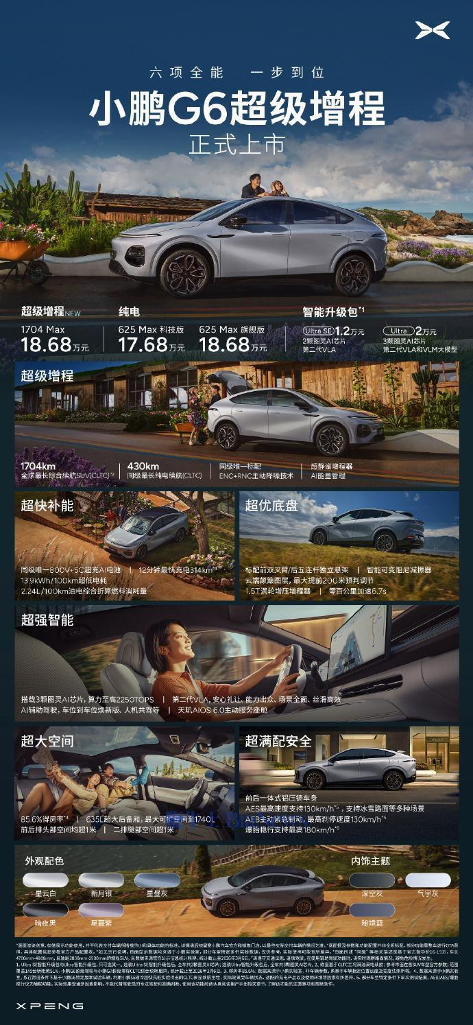 据先容,小鹏G6超等增程长宽高折柳为4771mm、1920mm、1650mm,轴距为2890mm。新车配备1704km概述续航,亚博app纯电续航430km。同期搭载第二代VLA系统,180km/h爆胎稳行,130km/hAEB刹停与冰雪AES刹停才气,底盘方面配备太极AI底盘。