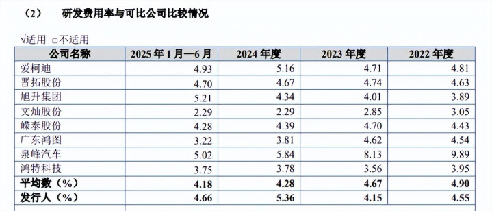 对比来看,可比同业研发用度率均值辨别为4.9%、4.67%、4.28%、4.18%,2024年,8家同业中仅泉峰汽车以5.84%跳跃公司,不外从研发用度限制来看,公司在8家同业中处于垫底,以2024年为例,爱柯迪、晋拓股份、旭升集团、文灿股份、嵘泰股份、广东鸿图、泉峰汽车、鸿特科技辨别为34,822.77万元、5,494.25万元、19,146.94万元、14,285.80万元、10,313.54万元、30,660.33万元、13,444.40万元、6,537.63万元,研发用度参加仍有待进一步加强。