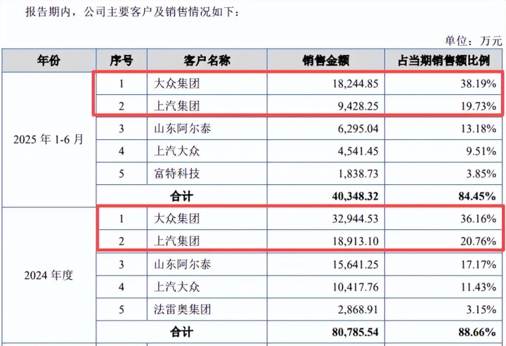 8成以上收入着手前五客户,供应商鸠合度也不低。解释期内,安达股份上前五名客户的销售额辨别为6.76亿元、8.07亿元、8.08亿元、4.03亿元,占比辨别为87.65%、87.35%、88.66%、84.45%,客户包括民众集团、上汽集团、山东阿尔泰、上汽民众、富特科技、法雷奥集团、中国一汽。