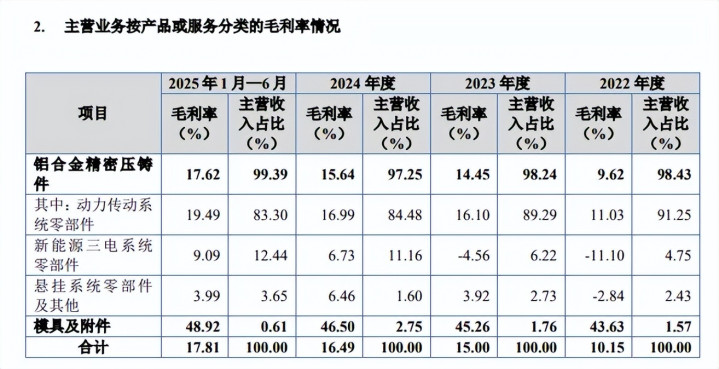 据短平快解读了解,主交易务收入主要着手于铝合金精密压铸件,解释期内辨别为7.43亿元、8.86亿元、8.62亿元、4.61亿元,占比辨别为98.43%、98.24%、97.25%、99.39%,包括能源传动系统零部件、新能源三电系统零部件、吊挂系统过火他零部件,期末收入辨别为3.86亿元、5773万元、1694.48万元,占比辨别为83.3%、12.44%、3.65%。
